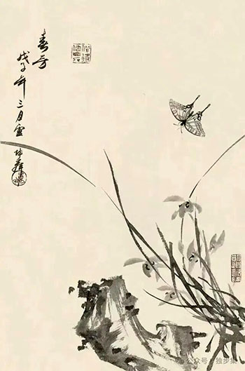 六 根磐石上缘幽谷,(清)石 涛 兰吐幽香竹弄姿。(明)李日华 叶乱花迷浑是墨,(清)李方膺 东涂西抹鬓成丝。(清)吴昌硕
