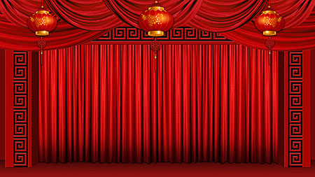 一对男女报幕员从舞台左边沿着红色幕布的边沿走到舞台中间。