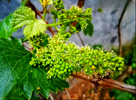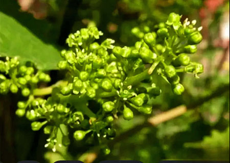葡萄园整个水泥框架结构上爬满了绿色的藤蔓植物,包括正在开始开花结果的小串串,葡萄小花谢了以后,在花蒂处开始长出小葡萄籽。