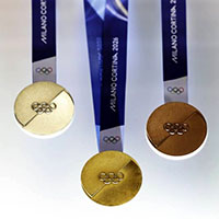 奖牌 2026年米兰-科尔蒂纳丹佩佐冬季奥运会奖牌的正反面都采用两个半圆连接在一起的设计,象征着米兰与科尔蒂纳两座城市的携手合作,更承载着胜利之魂与为实现梦想所付出的拼搏。 两枚半圆奖牌通过奥林匹克与残奥会的价值观连接在一起,它们代表着运动员走到这一步所付出的努力,也代表着运动员的家人、教练员、理疗师等整个团队的努力。 奖牌正反面采用两个半圆连接设计,象征米兰与科尔蒂纳的合作。正面分别为奥运五环及残奥会标志,背面分别为米兰冬奥会及冬残奥会标志。冬残奥会奖牌背面刻有盲文,侧面标注奖牌类型(金牌、银牌或铜牌)。米兰冬奥会品牌、形象与视觉总监拉法埃拉·帕尼耶参与了奖牌设计。米兰冬奥会组委会主席乔瓦尼·马拉戈表示,奖牌代表着意大利的创意、对体育的激情以及意大利之美。 2026年米兰-科尔蒂纳丹佩佐冬季奥运会奖牌由意大利国家造币印钞局打造,采用环保、无毒、可回收的保护涂层制成,制作奖牌所用能源全部来自可再生能源。
