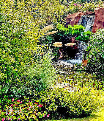 小亭周围的环境很好,三面有花园环绕,小亭的背面有一座小山,山上有一泉水流出来,估计这泉水和地下水有关。因为无论天多旱,这泉水始终不紧不慢地往外流。泉水旁边的岩壁上,有两个草书体字:匀泉。