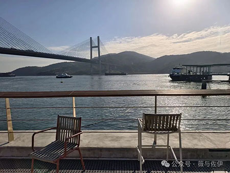 更惬意的是,有二三好友或家人一起,于海边择一篷遮阳伞面海而坐,或者索性就倚靠于平台栏杆,眺望大屿山层层叠叠起伏的峰峦,欣赏汲水门大桥上如巨型竖琴琴弦的斜拉线,看蓝绸海面波光亮闪,开怀畅饮聊天,尽情享受与远山、天海、跨海大桥同框的美妙瞬间。