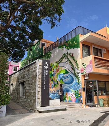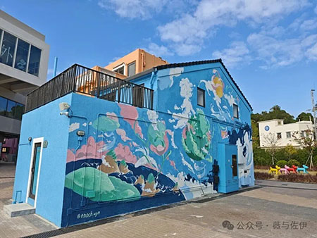 这些色彩艳丽的小楼,栋栋独立,造型各具风格,墙面或黄、橙,或粉、蓝积木色块式组合,或者是被巨幅彩色喷绘壁画覆盖,赤橙黄绿青蓝粉,热烈、浪漫、活泼。那一墙一墙的绘画,内容丰富:有渔村历史、渔家生活日常,有渗满香港本土文化原素的奇幻主题、海洋生物、环境生态等,它们都是香港本土和海外艺术家联手的杰作。