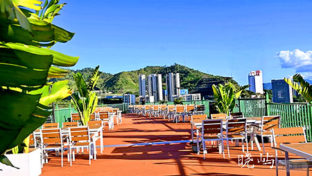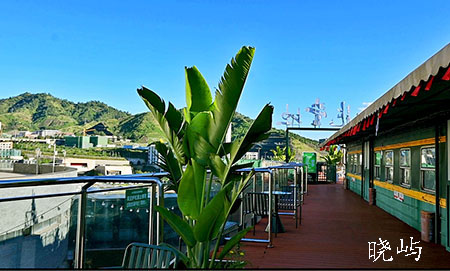 与列车平行向前延伸的是室外鲜花陪伴的休闲桌椅,既可休息,还可欣赏美景,在绿皮火车的尽头是一个延伸出去的观景平台,可以看到攀枝花新区的全景,大气,壮观。