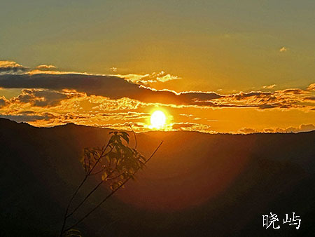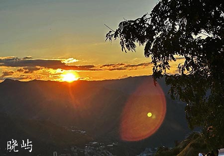 夕阳更加亮丽,镜头里包裹夕日光环的外围,还有一轮斜着的半个桔红色光晕,倾斜着护卫着美丽的夕阳,美轮美奂。桔红色光晕的中心部位,还有一明一暗两个金色的光点,像折射的小太阳,他们互相呼应,彼此辉映,把最美的一面留给在这山上观看落日的人们。