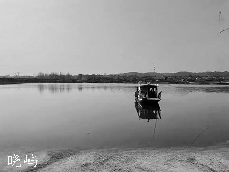 众人一起从坡上下到江边,一艘小船在江边停泊着,船上一个小伙子在坐着抽烟,不知是在等人,还是在准备垂钓。